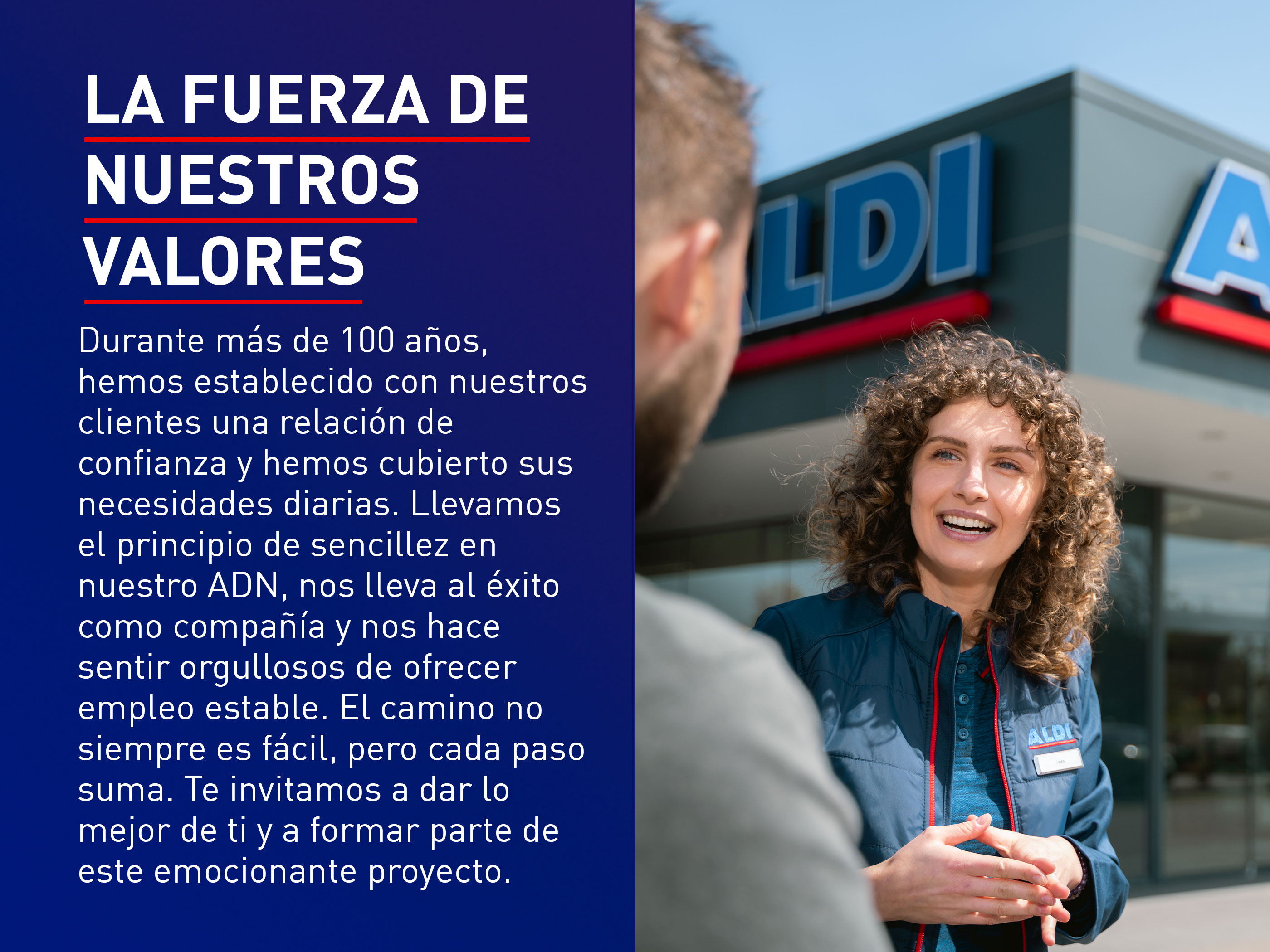 Trabajar en ALDI es fuerza, compañerismo, dinamismo, aprendizaje y desarrollo. Descubre cómo se viven las aperturas, qué se siente al crecer en la compañía o cómo es formarse y asumir retos en ALDI. Te lo cuentan, en primera persona, nuestros equipos.