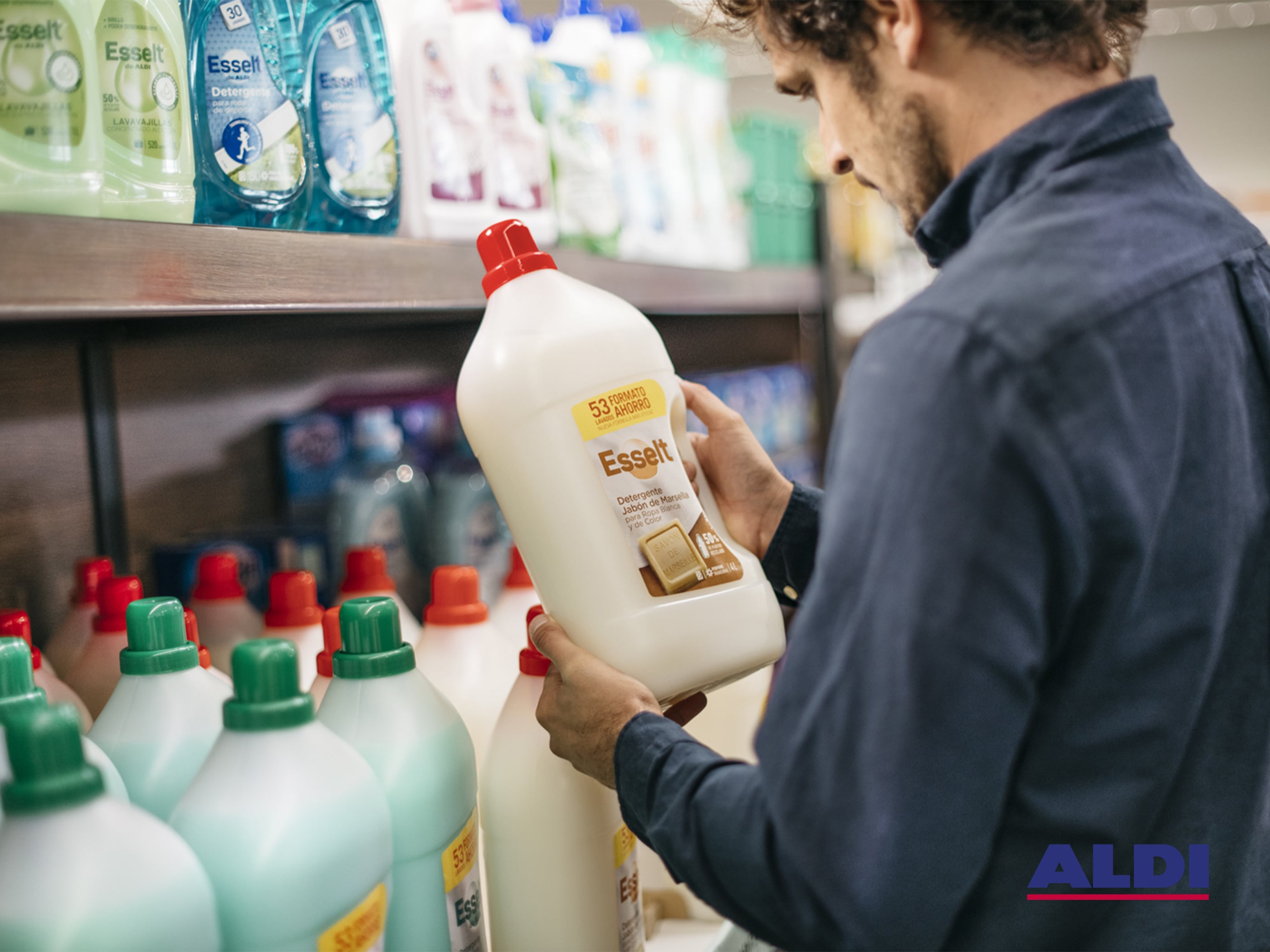 Sant Cugat del Vallès, 6 de septiembre de 2021-. ALDI está aplicando nuevas medidas medioambientales para reducir su huella plástica. La cadena de supermercados ya cuenta con 16 productos de detergencia que tienen plástico reciclado en su envase, desde un 25% y hasta el 100%. Aparte de este material sostenible, la compañía también utiliza otras opciones para crear los envases de sus artículos de detergencia, como embalajes de cartón.