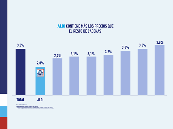 Los últimos datos del sector y la evolución del IPC en gran consumo sitúan a ALDI como la cadena que más ha contenido la subida de precios en el último año, por debajo de la media del mercado.