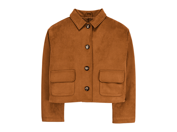 La colección incluye dos modelos distintos para adaptarse a diferentes estilos. Por un lado, una chaqueta de inspiración camisera en color camel, con cierre de botones delantero y bolsillos de parche con solapas, que aporta un estilo clásico y fácil de combinar.