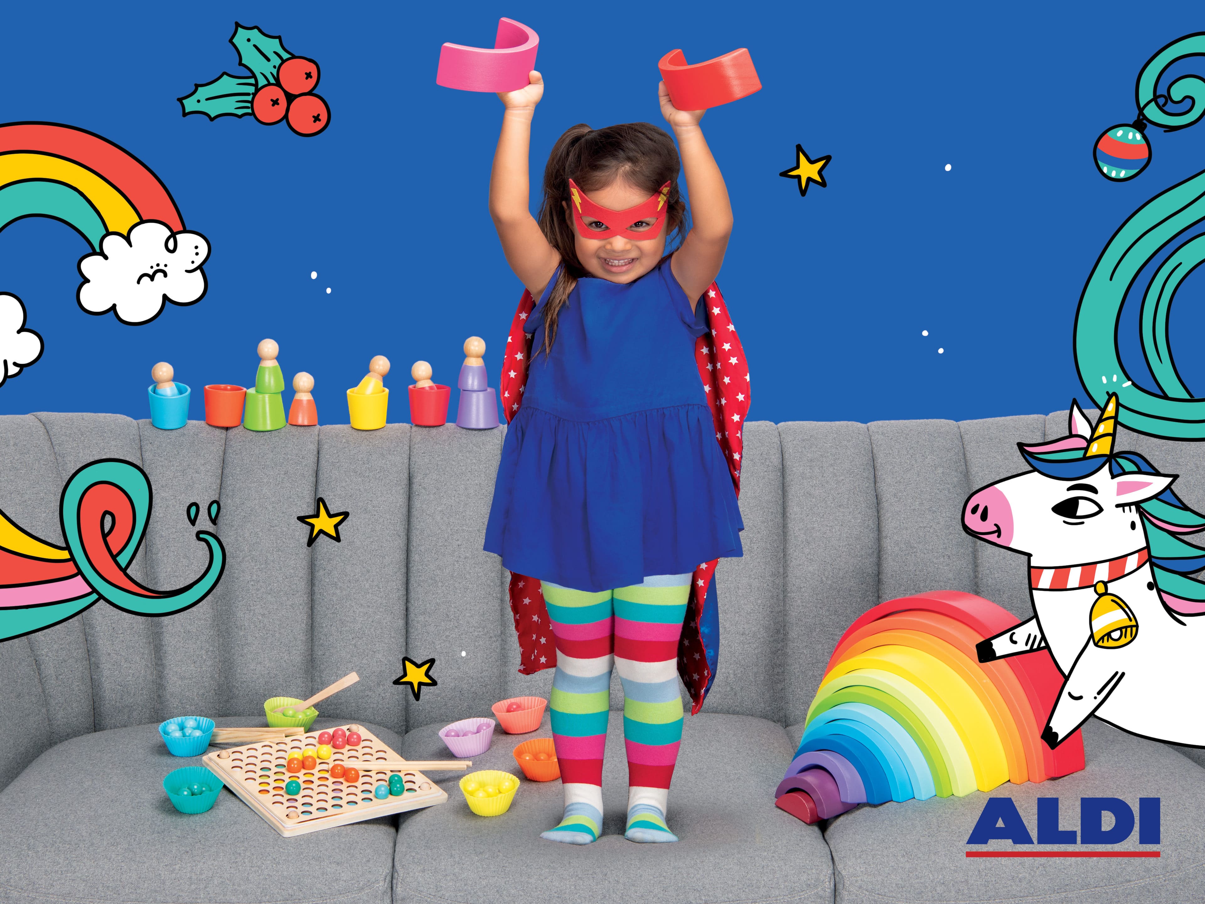Para ayudar a los Reyes Magos, ALDI ha lanzado este año una amplia gama de juguetes, con 430 propuestas, la mitad de ellas con un precio igual o inferior a los 9,99 euros. De estas, más de 120 son de madera sostenible. Destacan el árbol musical o el arcoíris (14,99 euros cada uno) entre los preferidos de los más pequeños.